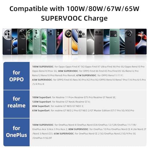 Compatibilidad OPPO Cargador 100W y 8A Cable USB C: diseñado para 100W SUPERVOOC Oppo Find X7 5G/Find X7 Ultra/Find X6 Pro 5G/Oppo Reno10 Pro Reno10 Pro+ 5G,80W SUPERVOOC para OPPO Find X6 Find X5 Pro/Find X5 5G/Reno12 Pro Reno12 Reno10 Pro/Reno8 Pro/Reno8; 67W SUPERVOOC para OPPO Reno11/11 F;65W SUPERVOOC para OPPO Find X3 Neo/X3 Pro/X2 Pro/X2/OPPO Reno10 Reno7 Pro/7/6 Pro/6/5 Pro/5/4 Pro/4;para OPPO A98 A97 A96 A95 A94 A93 OPPO A79 A78 A77 A76 A74 A73 A59 A36 A38 A58 A18 A55 A57 OPPO A56s A57s A77s/OPPO Reno12 F Reno8 T/Reno7 Z/Find X/Reno3 Pro/3;para Realme GT Neo 3T/GT Neo 3/GT NEO 2 Pro/GT Master Edition/GT/7 Pro/X50 Pro/Realme 12 Pro,para OnePlus 12/12R/11/11R/10 Pro/10R/Nord CE4