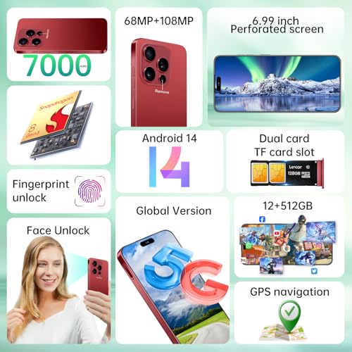 Especificaciones: 16PROMA X 5G teléfonos desbloqueados, bolígrafo integrado, batería para teléfono inteligente de 7000 mAh, pantalla HD de 6.8 pulgadas, teléfono celular desbloqueado, 12+512 GB Android14