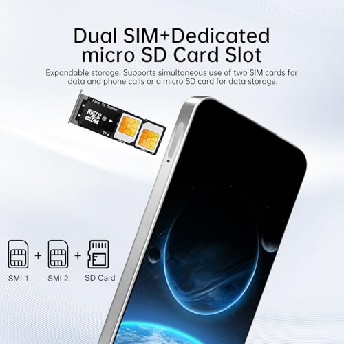 Especificaciones: 16PROMA X Teléfono desbloqueado, pantalla HD de 6.99″, teléfono de 8+256GB con tarjeta de memoria de 128GB, teléfono celular Android 13.0, cámara de 108MP y 68MP, botón de acceso directo