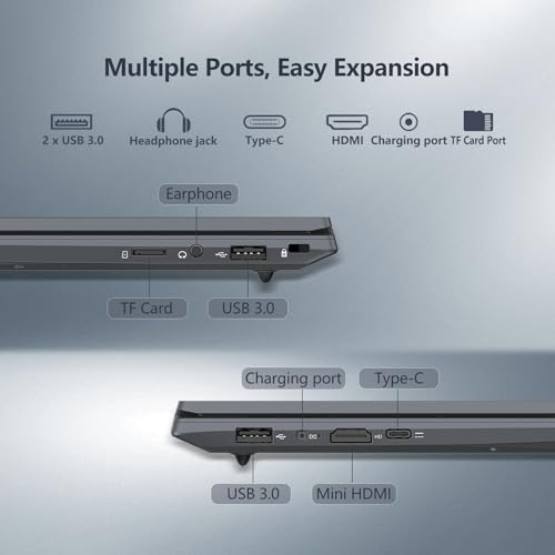 Ampliabilidad rica y de calidad: Esta pc portátil está equipada con USB 3.0 × 2, MINI-HDMI × 1, audio/micrófono de 3.5mm × 1, soporte para tarjeta TF × 1, puerto de carga × 1.