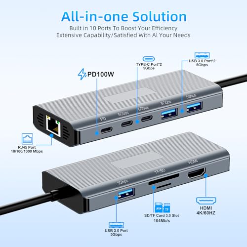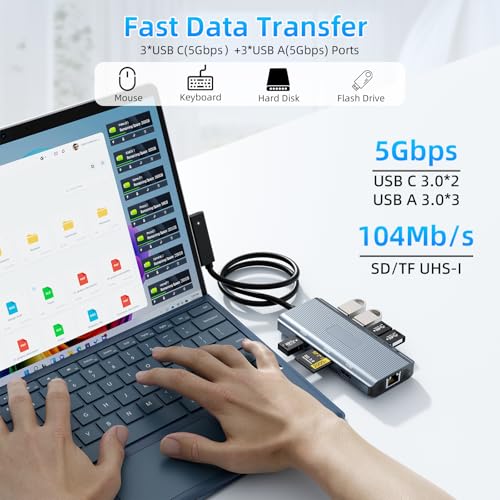 Estación de acoplamiento de superficie multifuncional 10 en 1: con este adaptador múltiple de concentrador de superficie puedes extender fácilmente tu laptop desde un puerto de conexión de superficie a 10 puertos, obtienes HDMI 4K, 3 puertos USB 3.0, 2 puertos USB C de transferencia de datos (velocidad de hasta 5 Gbps), puerto de entrega de energía USB C (hasta 100 W), Gigabit Ethernet (1 Gbps), SD/Micro SD lectores de tarjetas.Enjoy Conectividad plug-and-play perfecta con tus dispositivos Surface