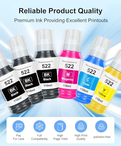 Diseño a prueba de fugas y garantía de calidad: después de rellenar, levanta los sellos de botella de tinta 522 automáticamente para evitar fugas. Controles de calidad estrictos, garantía de 24 meses; Reemplazo gratuito para productos defectuosos.