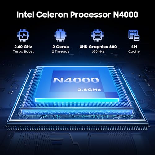 Rendimiento diario sin problemas: este ordenador portátil delgado funciona con un procesador Celeron N4000 con UHD Graphics 600, perfecto para trabajo remoto, navegación web y transmisión de video.