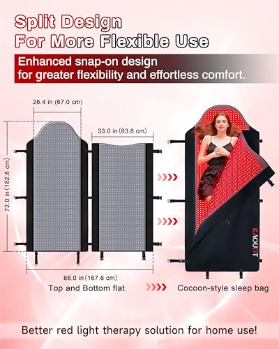 Diseño de 72 x 33 pulgadas y estructura de doble alfombrilla desmontable (superior + inferior), se puede utilizar plana o encajar como una bolsa de dormir de terapia de luz roja estilo capullo. Personalizado para uso doméstico, proporciona tratamientos específicos de cara a pies mientras cubre la espalda, las articulaciones y las piernas