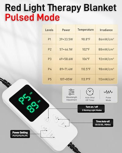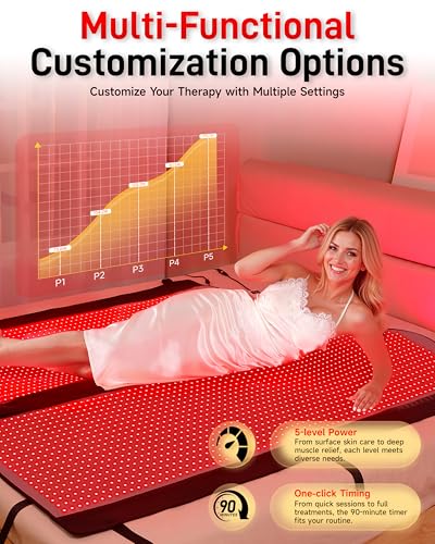 Manta de terapia de luz roja de cuerpo completo con un controlador multifunción, L. a. alfombrilla ofrece modo common, dos modos pulsados, cinco niveles de intensidad y un temporizador ajustable de hasta 90 minutos. Elige entre 15 modos para personalizar tu terapia para adaptarse a tu condición y preferencias