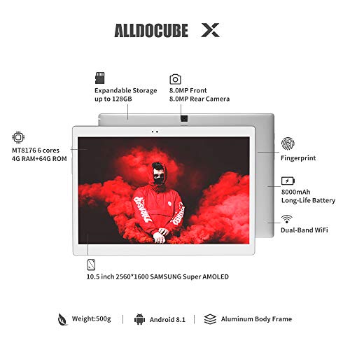 Especificaciones: ALLDOCUBE X Tablet,10.5’’ 2K AMOLED (WiFi, RAM de 4 GB, ROM de 64 GB, Android 8.1,6.9mm Ultra Slim) Huella Dactilar,Type-C,Plata
