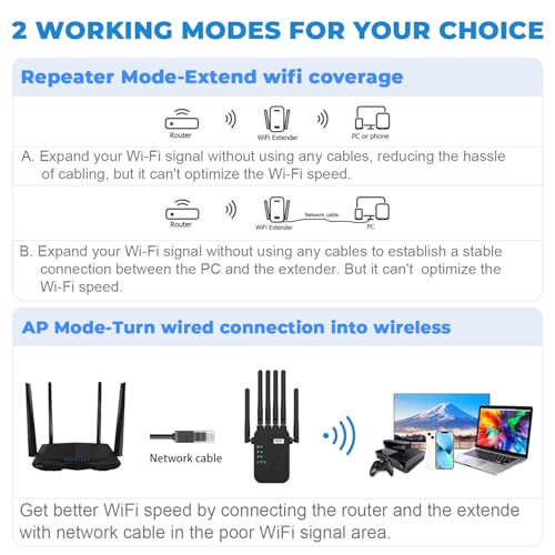 Extensor WiFi de doble modo: conectividad inalámbrica + cableada. Utiliza el modo repetidor para una cobertura inalámbrica de 1200 Mbps ultrarrápida, o cambia al modo AP con un puerto Ethernet de 100 Mbps para conexiones cableadas estables sólidas a PC, televisores inteligentes y consolas de juegos