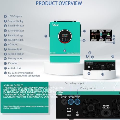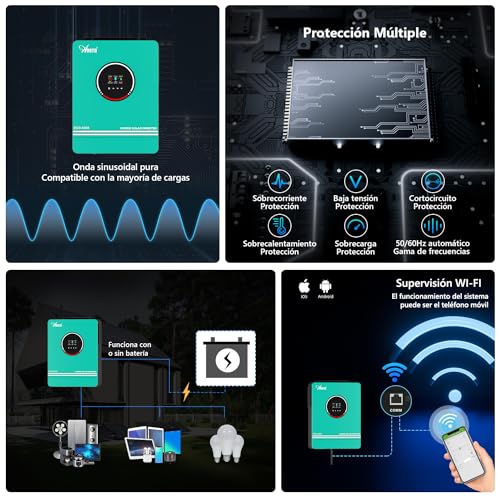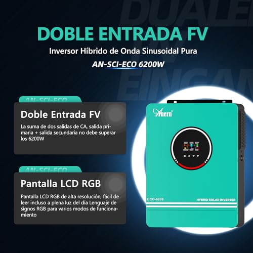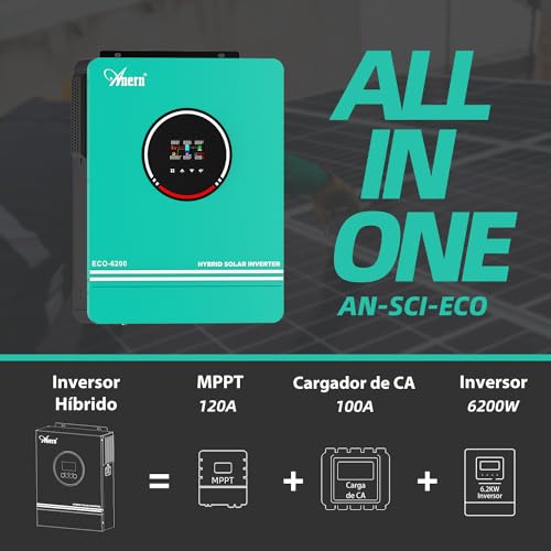 Especificaciones: Anern 6200W Inversor Solar Híbrido 48V DC A 220/230V AC Com MPPT Controlador De Carga Solar 120A Tensión de Entrada PV Máx.500V, Funciona con Baterías de Plomo y Ácido de Litio (6.2KW con WiFi)