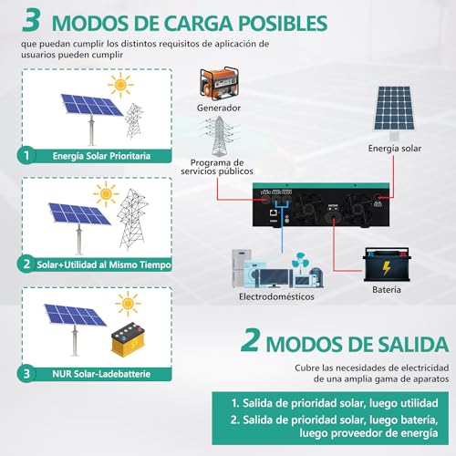 【Prolonga la vida de las cargas】: este inversor solar híbrido utiliza una avanzada tecnología de onda sinusoidal pura que proporciona a los dispositivos eléctricos una corriente alterna estable y de alta calidad, protege los productos electrónicos o electrodomésticos y prolonga la vida de la carga. Cargador inversor solar apto para baterías de plomo ácido, gel y litio. (debe ajustarse mediante «Personalizado»)