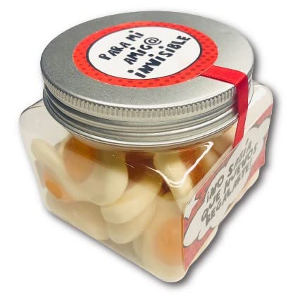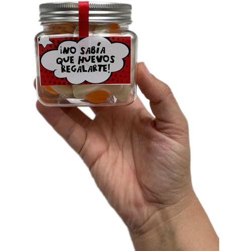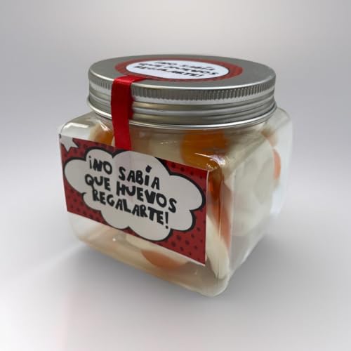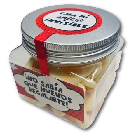Con dulce todo es mucho mejor. Un bote lleno de chucherías es mas que una alegría, es una bendición como diría tu abuela. Con frases divertidas para regalar en un amigo invisible. Capacidad: 300ml.Bote lleno de gominolas con la frase: Para mi amigo invisible. No sabia que huevos regalarte.