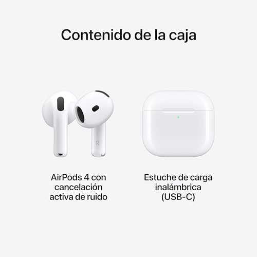 Especificaciones: Apple AirPods 4 cancelación Activa de Ruido, Auriculares inalámbricos, Bluetooth, Audio adaptativo, Modo de Sonido Ambiente, Audio Espacial Personalizado, Estuche de Carga USB-C y Carga inalámbrica