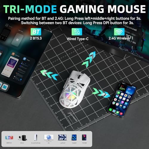 Triple Mode Connection: Seamlessly switch between 2.4GHz wireless, BT5.3, and wired USB modes—this gaming mouse can store up to 4 devices for quick switching between gaming and place of job scenarios. As a wireless gaming mouse, it offers broad compatibility with Windows, Mac OS, Linux, and Android systems, suitable for desktops, laptops, Macs, and more