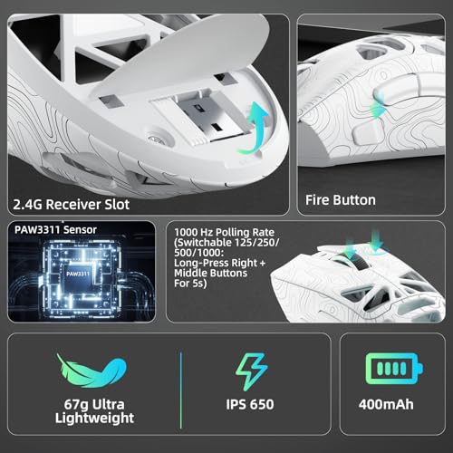Ergonomic and Lightweight Design: Weighing just 67g, this wireless mouse for laptop delivers fatigue-free gaming and work sessions—perfectly suited for claw, palm, or fingertip grips. The white mouse’s streamlined shape naturally conforms to your palm, effectively reducing wrist strain all over marathon gaming sessions or all-day place of job tasks. An very important choice for gamers and professionals looking for comfort without compromising performance