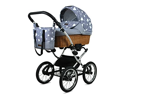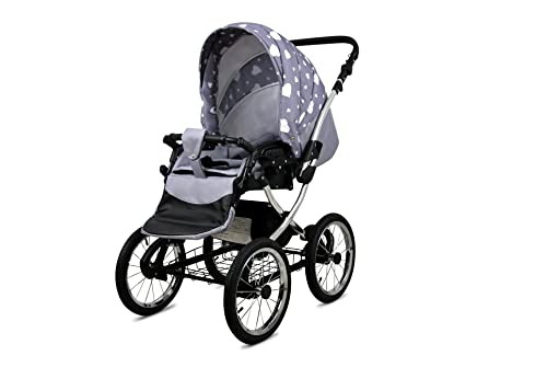 Babylux Cochecito de Bebé 3en1 Con Asiento de Coche para Niños Pequeños – Cochecito de Bebé para Recién Nacido y Niño Pequeño –– 59x105x125cm – Max 15kg – Silver Hearts Silver Frame