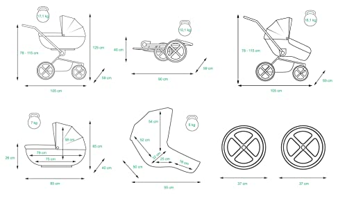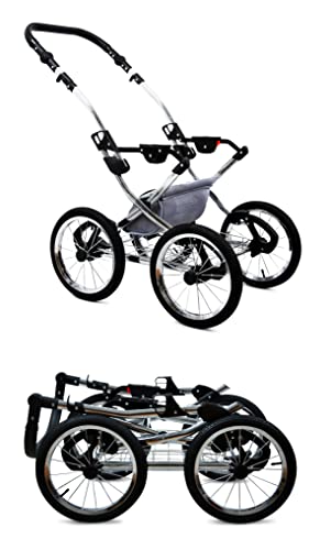 Juego completo: El conjunto se compone de: góndola de mimbre regulable con cabina, funda y forro, silla de paseo, cabina y funda, cinturones de seguridad de cinco puntos, bolsa para accesorios, cesta de la compra, protector de lluvia de plástico, mosquitera, estructura de aluminio con guía con ajuste de altura, un asiento para el automóvil y ruedas neumáticas de 14 pulgadas para un movimiento suave.