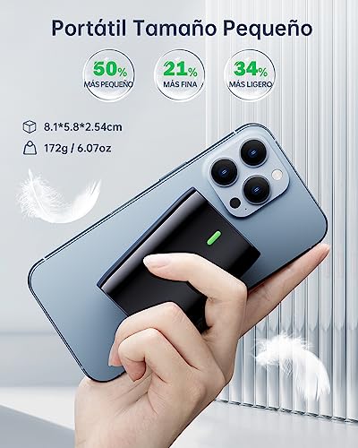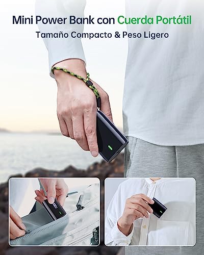 Compacto & Portátil – Pequeño tamaño con un gran rendimiento. Uno de power bank 10000mah más pequeños y ligeros del mercado. Tamaño 8.09* 5.42* 2.49cm, peso 170g(con un cable USB-C). Este power bank mini puede ser conveniente para la vida diaria, los viajes. Cabe en la mayoría de los bolsillos.