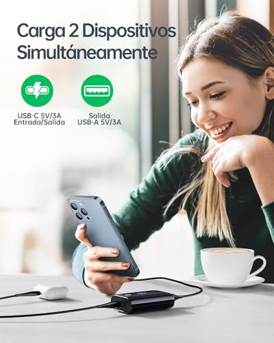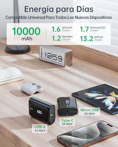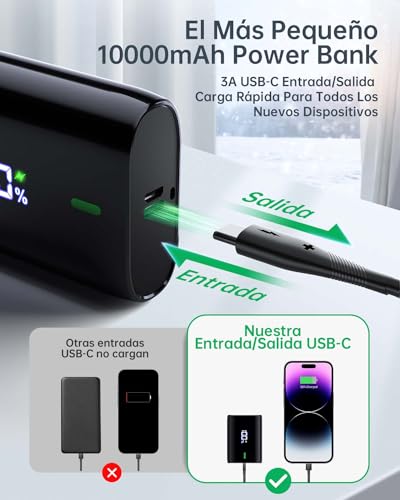 Especificaciones: Bateria Externa 10000mAh, Mini Power Bank con Pantalla LED, 3A USB-C (Input & Output) Bateria Portatil Carga Rapida Compatible con iPhone 15 14 13 Galaxy S23 Xiaomi Airpods