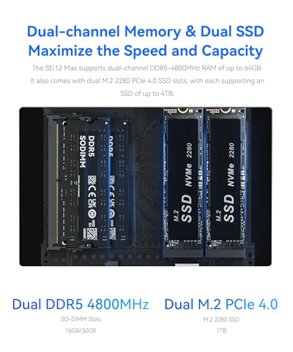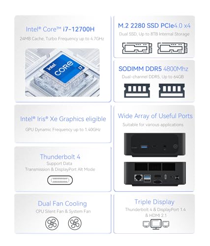 Especificaciones: Beelink Mini PC SEi12 MAX, Intel Core i7-12700H (14C/20T, hasta 4,7GHz), 32GB DDR5 500GB M.2 PCIe4.0 SSD, 4K Triple Display, Thunderbolt 4, HDMI2.1, DP1.4, BT5.2, WiFi6, 2.5G RJ45, Mini Ordenador