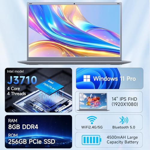 BLUEING Computadora portátil, 8 GB de RAM 256 GB SSD portátil, procesador Pentium Quad-Core (hasta 2.64 GHz), 1080P FHD IPS de 14 pulgadas, Wi-Fi 5, BT5.0, Win 11, portátiles para estudiantes, ligero