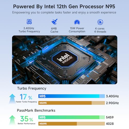 Rendimiento mejorado con N95: alimentado por el procesador Intel Alder Lake N95 de 12ª generación (4 núcleos, 4 hilos, hasta 3.4 GHz, caché de 6 MB), el Bmax X15 Pro ofrece un rendimiento superior en comparación con Celeron N5095 o N5105. Esta optimización lo convierte en una computadora portátil ideal para trabajos ligeros de oficina, educación en línea y entretenimiento en el hogar. Los gráficos Intel UHD integrados (hasta 1200 MHz) garantizan una reproducción de video 4K a 60Hz fluida y maneja tareas de productividad ligera con facilidad.