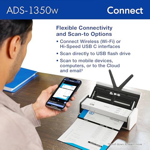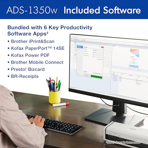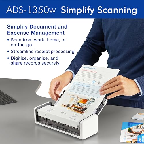 Manage your work, and digitize your life from work, home, or any place your life takes you with the Brother ADS-1350W Compact Desktop Scanner. It’s perfect for busy people on the go – a combination of wireless capability and the Brother Mobile Connect app(1) for iOS® and Android™ lets you scan from virtually anywhere to your computer or the cloud(4) when connected to your scanner over a Wi-Fi connection. Whether you’re at home, at the office, or working from the coffee shop, you can scan and organize almost anything! Clearing your paper clutter has never been easier. The Brother ADS-1350W handles large jobs with ease, with fast scanning speeds up to 30ppm(2), 20-page automatic document feeder(3), and easy single-pass double-sided scanning capabilities. You won’t believe the scanning power you get from this small but mighty scanner. Whether you’re scanning photos, organizing your library of business cards, tracking ID cards, digitizing your tax forms and receipts, or scanning forms and contracts, the Brother ADS-1350W is your partner to get the job done quickly and efficiently. The scanner delivers precise black and white or color scans at a sharp 600 x 600 dpi. Features like automatic color detection and adjustment, image rotation (PC only), bleed through and background removal, and text enhancement will help make your scans sharp, readable and searchable. This energy-efficient scanner is ENERGY STAR 3.0 and EPEAT SILVER certified, with built-in power saving features like sleep mode. It’s also powered directly through your computer or laptop via a USB-C connection (cable included), so you won’t need to deal with extra cables or plugs in the way. Perfect for daily or occasional scanning, the Brother ADS-1350W handles multi-page documents up to 8.5” x 14” from the automatic document feeder, and can scan single pages up to 197” long. It also features a handy card slot for easy scanning of ID cards, business cards, or almost any type of plastic card. Think of it as a virtual assistant – it comes bundled with software(1) to organize and manage your files, create and edit PDFs, connect with your scanner over Wi-Fi, manage your business card contacts, make documents readable and searchable, and automate workflows. Essential Productivity Software Apps included(1): Brother iPrint&Scan for Windows and Mac, Kofax PaperPort 14SE with OCR for Windows, Kofax Power PDF for Windows and Mac, Brother Mobile Connect App, Bizcard, and BR-Receipts. The ADS-1350W comes with Brother At Your Side support, including a 1-year Limited Warranty, and free online, call, or live chat support for the life of your scanner. It’s so simple to use, you’ll never know how you organized yourself without it. 4. Disclaimers 1. Additional download required. Compatibility may vary by device and operating system. May require connection to a wireless network. 2. Color and monochrome scan speed with all advanced features turn off, Letter at 300dpi. 3. Maximum Capacity based on using 20lb. Paper. 4. Internet connection and account with desired service required. ENERGY STAR and the ENERGY STAR mark are registered trademarks owned by the U.S. Environmental Protection Agency. Images are for illustrative purposes only. Specifications subject to change.