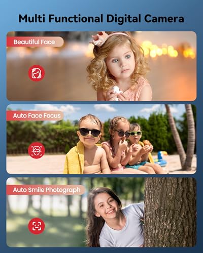 EXCELENTES FUNCIONES Y FÁCIL DISPARO: Esta cámara compacta no solo tiene tecnología antivibración para hacer que los niños sean más estables al disparar y evitar imágenes borrosas, sino que también actúa como una cámara web. No solo eso, también tiene una variedad de divertidos efectos especiales incorporados, como fotos en blanco y negro y detección de sonrisas, para que los niños puedan usar su creatividad al disparar y realizar obras únicas.