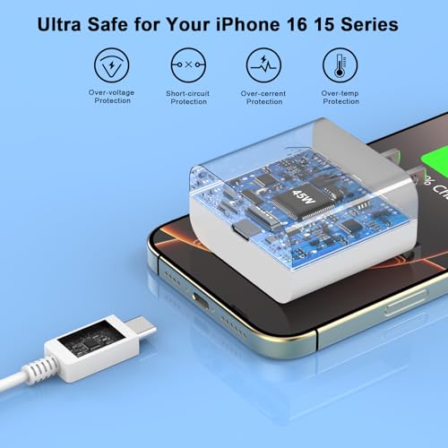 Cargador rápido para iPhone 16 de 45 W: el bloque de carga rápida PD de 45 W para iPhone 16 y el cable de carga USB-C a C extra largo de 10 pies proporcionan una potencia de salida máxima de 45 W, carga tu iPhone 16 Pro Max hasta un 75% en solo 30 minutos, 6 veces más rápido que el cargador USB original de 5 W