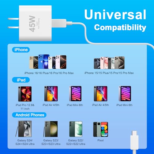 Compatibilidad universal: el bloque de carga USB C para iPhone 16 de 45 W con cable de carga USB C extra largo de 10 pies es perfectamente compatible con iPhone 16/16 Plus/16 Pro/16 Pro Max/15/15 Plus/15 Pro/15 Pro Max, iPad Pro 12.9/11 pulgadas, iPad Air 6ª/5ª/4ª 27.7 pulgadas. cm, iPad Mini 7 6º 8.3 pulgadas, iPad 10, MacBook Air/Pro. Este cargador para iPhone 16 Pro de 10 pies de largo también carga rápida para Galaxy S24/S23/S22/S21 Ultra Series, Pixel 8/7/6/5/4 y más dispositivos USB C.