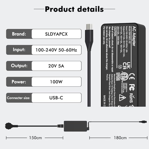 Entrada: 100 – 240 V. Salida: 20 V 5 A. Interfaz DC: tipo – C. El adaptador de corriente USB c es compatible con hasta 100W, admite protocolo de carga USB – C PD 3.0 y todos los dispositivos de interfaz tipo – C, computadoras portátiles y teléfonos Android