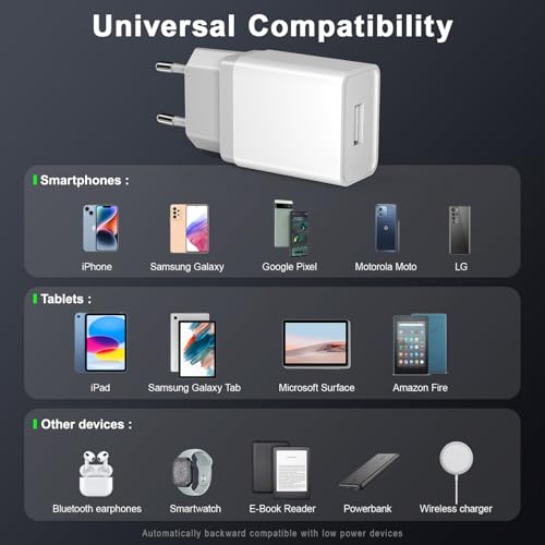 Compatibilidad Universal: Este cargador de pared USB esencial es compatible con una amplia gama de dispositivos, funcionando perfectamente con productos tanto de Apple como de Android, incluidos smartphones, tabletas, lectores electrónicos y más. Además, admite varios cables de carga USB, así que puedes olvidarte de las preocupaciones de compatibilidad.
