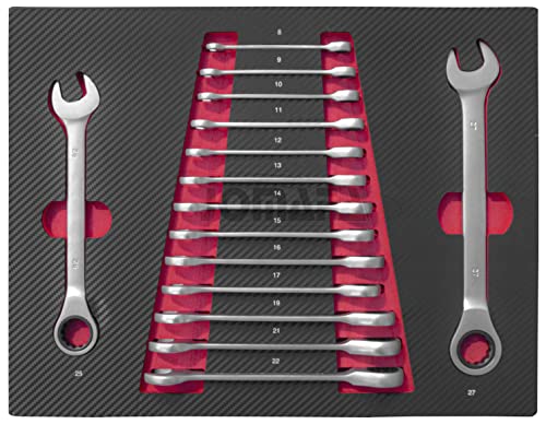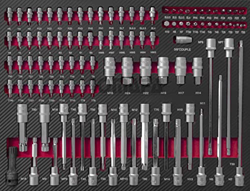 6 módulos de herramientas fabricados en espuma EVA con terminacion diseñada en fibra de carbono para asegurar una sujección perfecta de los utillajes dentro o fuera del carro y una gran durabilidad del cuerpo del módulo