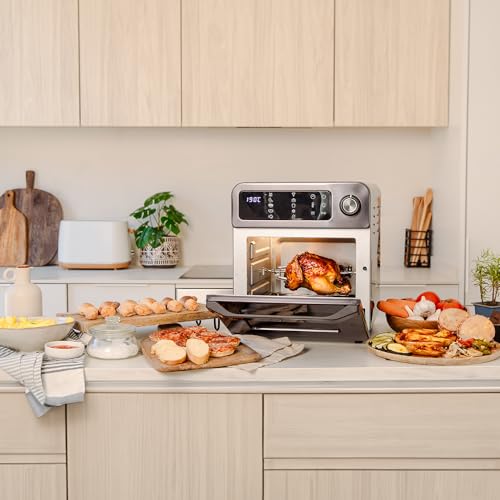 Accesorios completos: incluye bandeja de hornear, bandeja recogegrasas, estante de alambre, mango para bandeja, cesta de freír, cesta giratoria de freír, rustidor, mango para rustidor, estante para brochetas y brochetas.