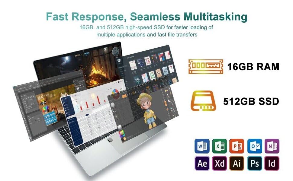 Potente rendimiento para un funcionamiento sin problemas: alimentado por el procesador de cuatro núcleos Celeron N5095 con una frecuencia turbo máxima de 2.9GHz y emparejado con 8 GB de RAM DDR4, maneja sin esfuerzo la multitarea. El SSD de 512 GB ofrece un aprovisionamiento 5 veces más rápido, lo que permite una rápida lectura y escritura de archivos y carga de programas. Ya sea que se trate de múltiples documentos comerciales o proceder software de adiestramiento complejo, garantiza un funcionamiento eficiente y acuoso.