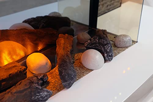 CARACTERÍSTICAS Y DISEÑO ECONOMÍA DE ENERGÍA: Con una potencia de 10 W a 2000 W, esta chimenea de acero y vidrio templado negro cuenta con protección contra el sobrecalentamiento. Se puede instalar en la pared o en el suelo y viene con guijarros decorativos. Solo consume 10 W en modo llamas