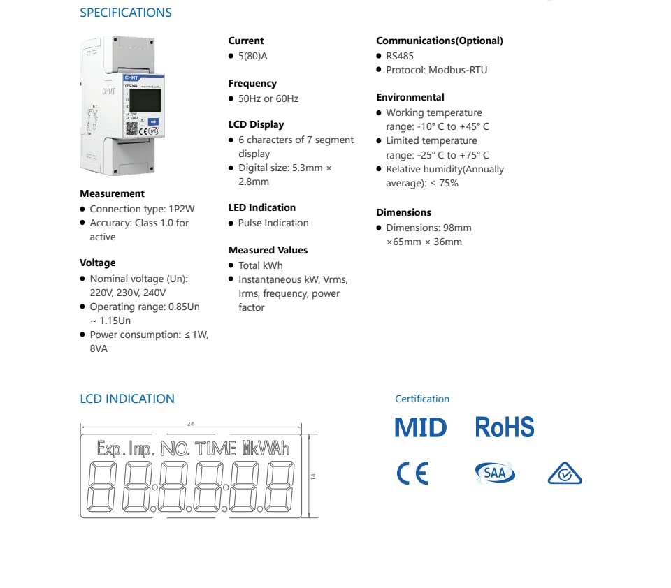 CHINT DDSU666 Medidor de electricidad monofásico para sistemas solares, certificado MID, 220-240V 80A 50/60hz 800 Imp/kwh. Ideal para reemplazar DTU microinversor/micro inverter.