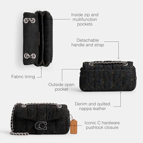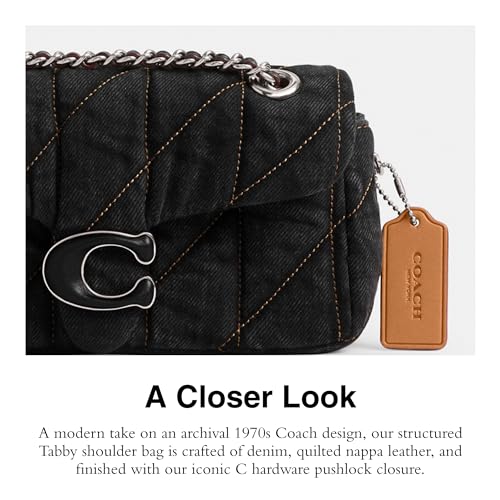 Una versión moderna de un diseño Coach de los años 70, esta bolsa estructurada Coach Tabby está hecha de mezclilla y piel de napa acolchada y acabada con un cierre de bloqueo y bolsillos magnéticos a presión para un fácil acceso a los elementos esenciales. Piezas abombadas. El cuero flexible se somete a una técnica de costura que requiere mucho tiempo para crear un efecto acolchado acolchado, para un bolso de diseño atemporal para mujeres.
