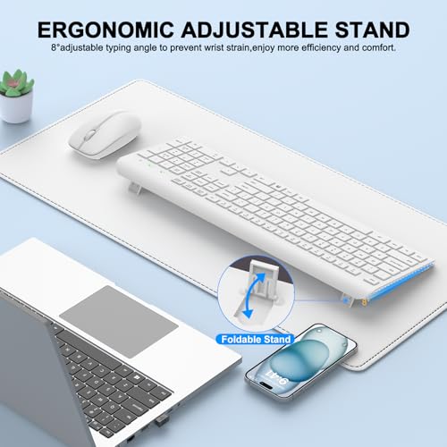【Combo ergonómico de teclado y mouse inalámbrico】Este teclado ergonómico inalámbrico está equipado con patas de inclinación de altura ajustable para aumentar la comodidad y evitar lesiones en las muñecas al escribir durante mucho tiempo. El teclado inalámbrico de tamaño completo incluye teclado numérico y 12 teclas de acceso directo multimedia, como reproducción/pausa, aumento y disminución de volumen y correo electrónico, para ayudarte a mejorar la eficiencia del trabajo