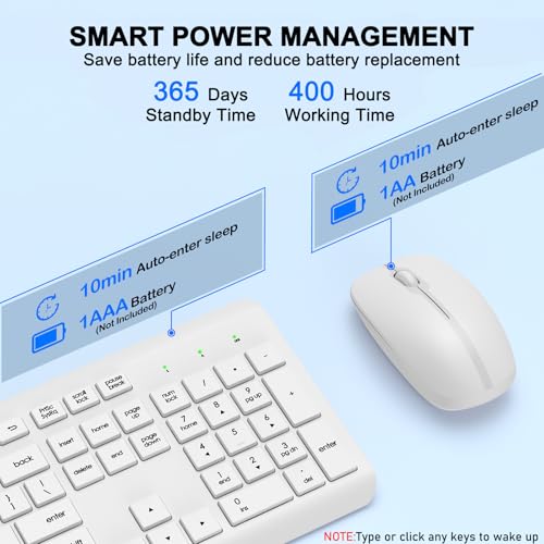 Batería de larga duración: hasta 365 días de duración de la batería para teclado y mouse inalámbricos, di adiós a la molestia de cargar cables y reemplazar las baterías. Después de 10 minutos de inactividad, el combo de teclado y mouse inalámbricos entrará automáticamente en modo de suspensión para ahorrar energía. Cualquier pulsación de botón activará los dispositivos nuevamente. El teclado inalámbrico requiere una batería AAA, y el mouse inalámbrico requiere una batería AA.