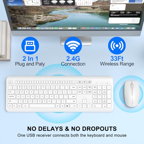 Especificaciones: Combo de teclado y mouse inalámbricos, teclado ergonómico silencioso de tamaño completo y mouse óptico, batería de larga duración, teclado de mouse inalámbrico sin retrasos de 2.4 GHz para computadora