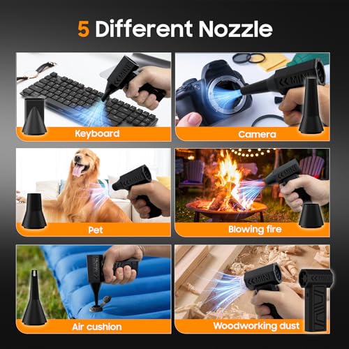 【Wide Application】The compressed air duster rechargeable has 5 different sized nozzles with noise reduction. Great for cleaning electronics like pc, keyboards. It also serves well for home clean and car duster