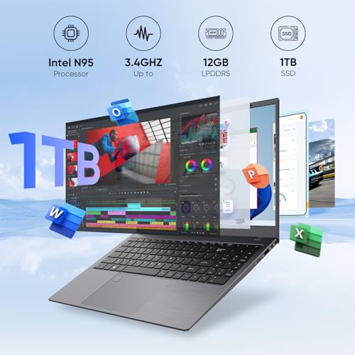 Computadora portátil, 12 GB LPDDR5 RAM 1TB SSD, procesador N95 de cuatro núcleos hasta 3.4 GHz, pantalla FHD IPS de 15.6 pulgadas, WiFi 5, computadora portátil con huella digital para