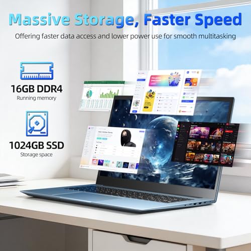 Rendimiento potente: Afronte los cursos exigentes y las tareas empresariales sin esfuerzo con 16 GB de RAM y un SSD rápido de 1024 GB. Esta computadora portátil de alto rendimiento maneja múltiples aplicaciones sin problemas. Alimentado por un procesador Intel Celeron N5100 (4 núcleos, hasta 2,8 GHz) y un ventilador de CPU dedicado, este portátil con Windows 11 garantiza un funcionamiento fresco y confiable. Es la herramienta versátil que trabaja tan duro como tú, perfecta tanto como una computadora portátil para estudiantes como una computadora portátil de negocios.