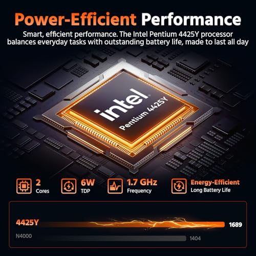 Rendimiento de bajo consumo: alimentado por el procesador Pentium ultra eficiente 4425Y, esta computadora portátil está diseñada para computación inteligente. Con un TDP mínimo de 6 W, equilibra de forma inteligente las tareas cotidianas, como la navegación web, la edición de documentos y las videollamadas, con una duración de batería excepcional. No se trata de poder en bruto; se trata de hacer lo que necesitas, todo el día, sin buscar una toma de corriente