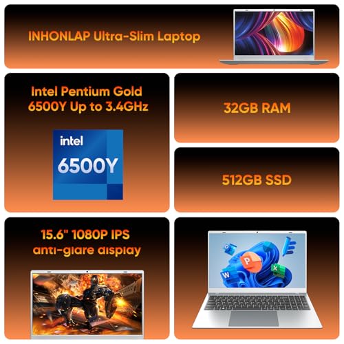 Computadora portátil de 15.6 pulgadas, 32 GB de RAM, 512 GB, SSD con procesador Pentium 6500Y de hasta 3.4 GHz, pantalla IPS de 1080P, WiFi 5, batería de 5 horas Win11, computadora portátil
