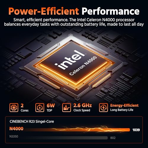 Procesador y tarjeta gráfica: los angeles computer win 11 Professional está equipada con el procesador Celeron N4000, con un impulso turbo de hasta 2.60 GHz, lo que garantiza un rendimiento estable y clever para las operaciones del sistema. Junto con gráficos UHD, ofrece una experiencia de usuario eficiente y conveniente, manejando fácilmente las tareas diarias, el aprendizaje y el trabajo ligero de oficina.