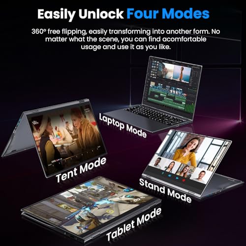 Portátil convertible: La computadora portátil 2 en 1 cuenta con una bisagra giratoria de 360°, lo que permite cuatro modos de uso: portátil, tableta, tienda de campaña y soporte. El diseño convertible mejora la eficiencia y el entretenimiento, por lo que es el compañero ideal tanto para el trabajo como para el juego