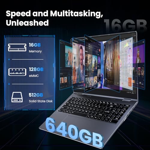 Especificaciones: Computadora portátil de 16 pulgadas, portátil convertible con 16 GB DDR5 RAM 640 GB de almacenamiento, IPS FHD pantalla táctil de 360 grados, teclado retroiluminado, lector de huellas dactilares