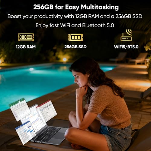 Computadora portátil FHD IPS de 15.6 pulgadas, 12 GB de RAM, 256 GB SSD de 4 núcleos N95 (Beats 6500Y, 8100Y) portátil con huella digital, teclado numérico, doble tipo C para trabajo de negocios