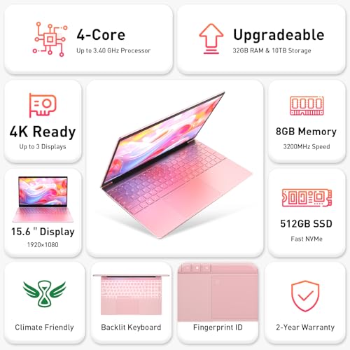 Computadora Portátil Notebook de 15.6″, 8GB RAM, 512GB NVMe, 4C4T N95 1.7-3.4GHz, Pantalla FHD, Teclado Retroiluminado, Lector de Huellas Dactilares, Win11 Pro, Actualizable a Almacenamiento de