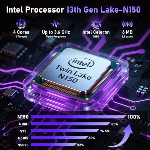 Rendimiento fluido para trabajar y jugar: alimentado por el último procesador N150 (4C/4T, 3.6GHz) y gráficos integrados (1GHz), este portátil ofrece velocidad de respuesta para multitarea, navegación y tareas diarias sin ralentizarlo.